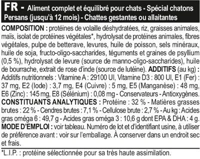 Pendant la croissance,le chaton Persan acquiert un pelage long,dense et soyeux,caractéristique emblématique de cette race de chat. L’aliment Persan Chaton avec une teneur adaptée en protéines et un équilibre précis de vitamines et de minéraux (dont du calcium et du phosphore) pour aider à favoriser la croissance tout en contribuant à la santé de la peau et à la beauté du pelage.
