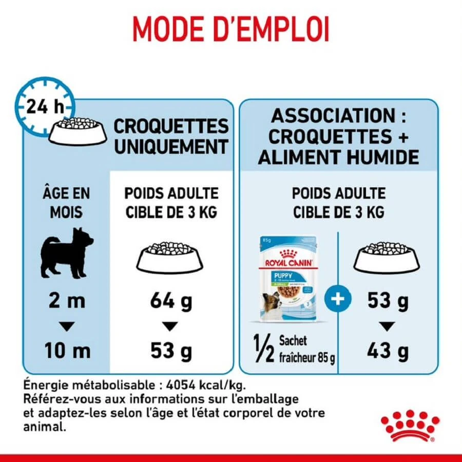 Royal Canin Puppy X-Small Chiot est un aliment complet pour chiots de très petites races (poids adulte inférieur à 4 kg) – Du sevrage jusqu’à 10 mois.