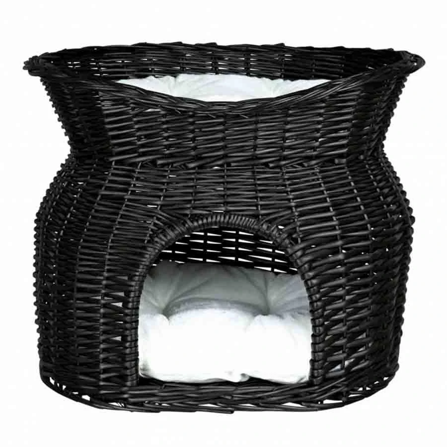 Le panier en osier possède une cachette si votre chat souhaite être tranquille ou faire une sieste. Il possède également un coussin en hauteur afin de lui offrir un point de vu pour observer ce qu’il se passe confortablement.
